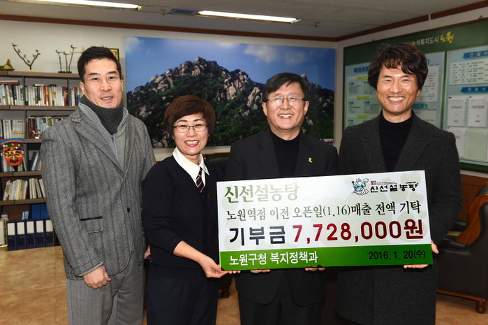 김성환 서울 노원구청장(오른쪽에서 두 번째)은 지난 20일 오후 3시40분 구청장실에서 신선설농탕 노원역점 기부금 전달식을 열고 신선설농탕 노원점장 및 담당팀장과 함께 기부금 전달식 후 기념촬영을 하고 있다.(사진제공=노원구청)