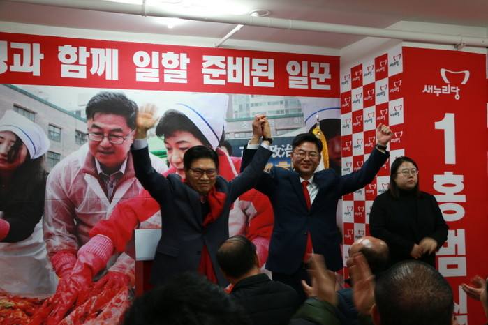 | 홍범식 예비후보(오른쪽)가 새누리당 홍문종 의원과 총선 필승을 다짐하고 있는 모습. | ||
