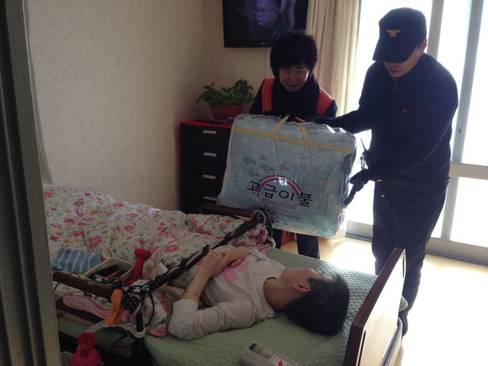 지난 24일 서울 동작소방서는 지속적인 한파로 취약계층의 동사 및 안전사고 대비를 위해 지역내 독거중증장애인 11명에게 구호물품(이불)을 전달했다. 사진은 소방서 관계자가 이불을 전달하는 모습.(사진제공=동작소방서)