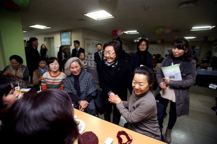 신연희 강남구청장이 지난 22일 오후 2시 강남구여성능력개발센터에서 열린 ‘홀몸어르신 돕기 모자 뜨개 행사’를 방문해 봉사에 참여한 손뜨개반 회원들을 격려하고 있다.(사진제공=강남구청)