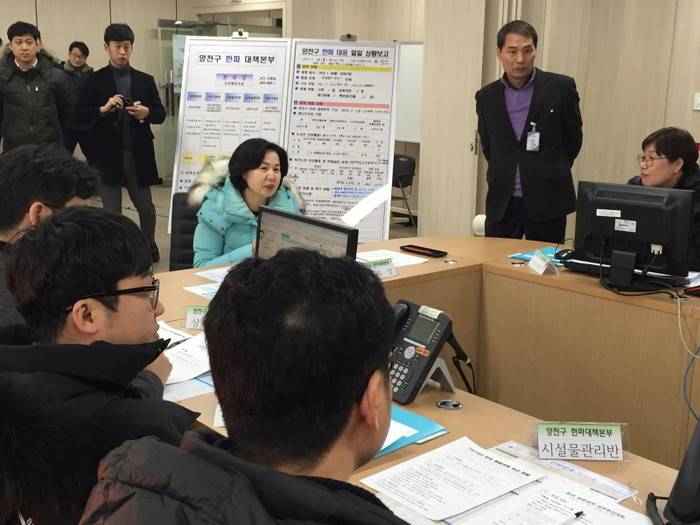 전국적으로 기록적인 한파가 몰아친 지난 24일 오후 김수영 서울 양천구청장(가운데)이 '양천구 한파대책본부'에서 현황 및 대응상황을 점검하고 있다.(사진제공=양천구청)