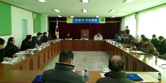 지난 25일 경북 구미시 무을면사무소 2층 회의실에서 김봉교 도의원, 장경수 무을파출소장, 김종명 무을농협조합장, 마을이장 등 25명이 참석한 가운데 새해 첫 이장회의를 개최했다.(사진제공=구미시청)