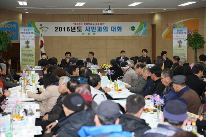 조병돈 경기 이천시장은 지난 25일 오후 3시30분 증포동 주민센터에서 시민 등 약 250명이 참석한 가운데 시민과 대화의 시간을 진행했다. 사진은 조 시장(앞줄 가운데)이 인사말을 하는 모습.(사진제공=이천시청)
