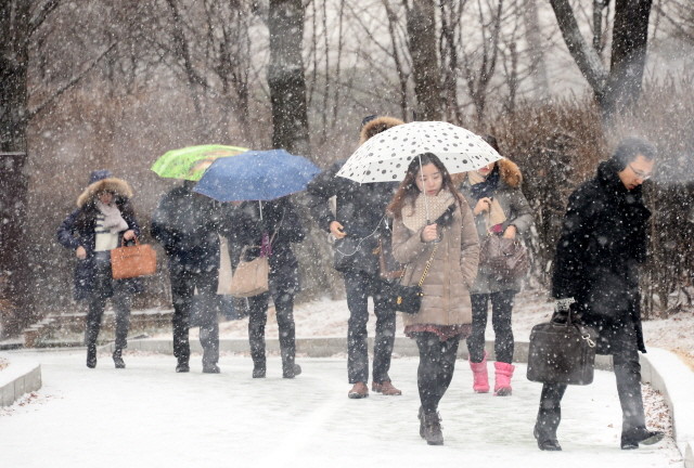 눈이 내린 26일 오전 서울 영등포구 여의도공원을 지나는 시민들이 출근길 발걸음을 재촉하고 있다.