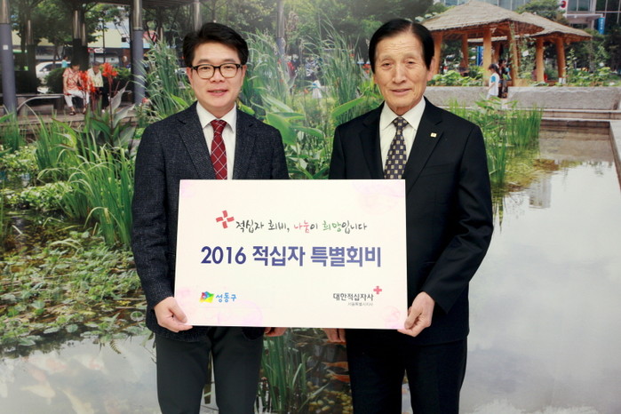 서울 성동구는 지난 26일 오후 5시 구청 전략회의실에서 ‘2016 적십자 특별회비 전달식’을 진행했다. 사진은 정원오 성동구청장(왼쪽)과 제타룡 대한적십자사 서울지사 회장의 모습.(사진제공=성동구청)