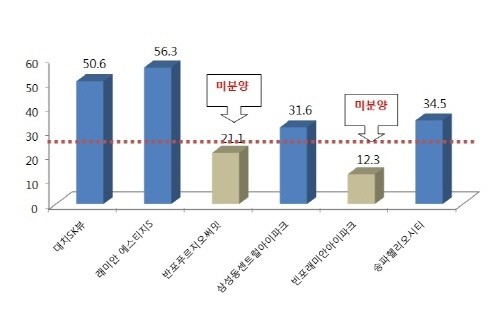 6개 단지 모두 청약 경쟁률에서는 두 자리숫자를 기록했지만, 계약률 현황을 보면 6개 단지 중 평균 '30대 1'의 청약 경쟁률을 기록한 4개 단지만이 100% 분양 완료를 달성했다.