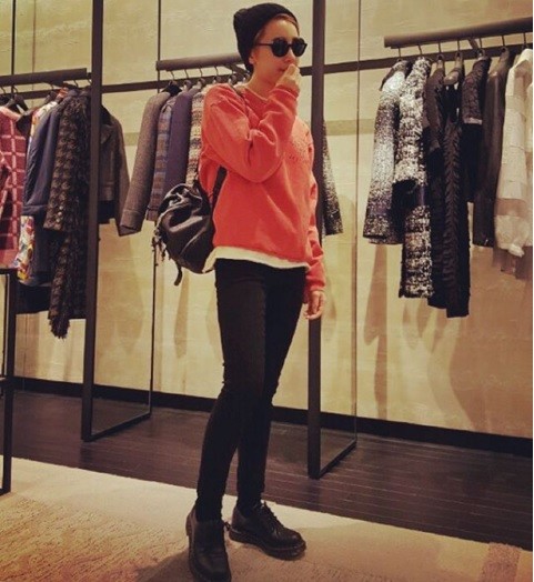 서인영은 공개된 사진 속에서 은은한 복숭아 색깔의 니트와 검은색 스키니진을 입은 채 어딘가를 바라보고 있다.