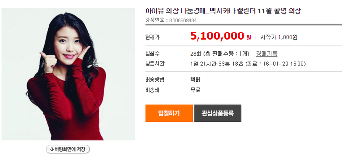 이번 행사는 옥션에서 진행되며 판매중인 제품 모두 아이유가 캘린더 촬영 당시 실제 착용한 의류이다.