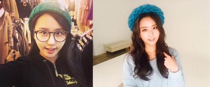 왼쪽 사진의 김소희는 검은 뿔테 안경과 초록색 모자를 쓴 채 귀여운 미소를 짓고있다. 김소희의 청순한 매력이 돋보이는 순간이다.