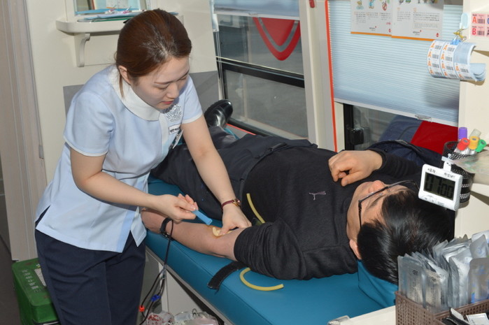 지난 27일 경기 동두천시는 시청 앞 현관 주차장에서 대한적십자사 동부혈액원의 협조를 받아 ‘공직자 사랑의 헌혈 운동’을 전개했다. 사진은 행사에 참석한 관계자가 헌혈하는 모습.(사진제공=동두천시청)