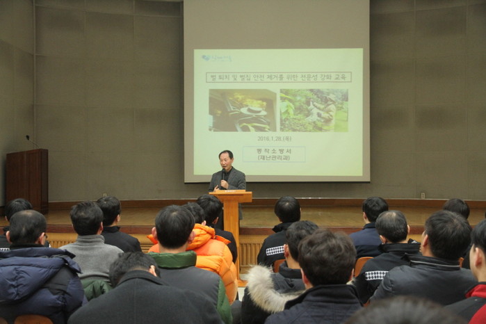 서울 동작소방서는 28일 오전 3층 강당에서 벌 퇴치 및 벌집 안전제거를 위한 전문화 교육을 실시했다. 사진은 양봉협회 전문가가 소방서 관계자들에게 교육을 진행하는 모습.(사진제공=동작소방서)