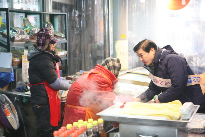 지난 26일 이해식 강동구청장은 상일골목시장과 고덕전통시장·명일전통시장을 들러 상인들을 격려하고, 구 간부들과 함께 설 명절 전통시장 이용 홍보에 나섰다. 사진은 이 구청장이 상인과 인사하는 모습.(사진제공=강동구청)