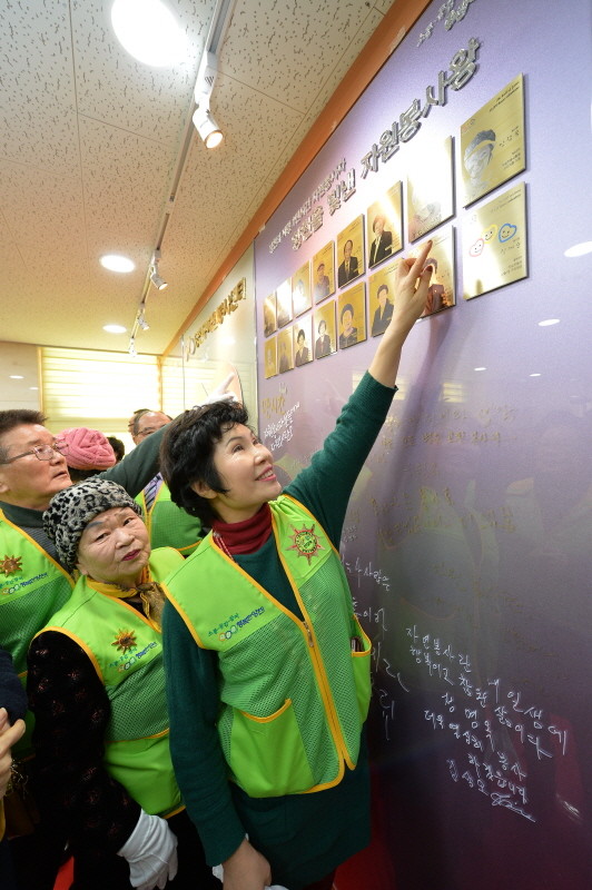 지난 27일 오후 서울 양천구 자원봉사센터 2층 로비에서 열린 ‘양천을 빛낸 사람들’ 제막식에 참석한 자원봉사자들이 자신의 얼굴이 담긴 동판을 보고 있다.(사진제공=양천구청)