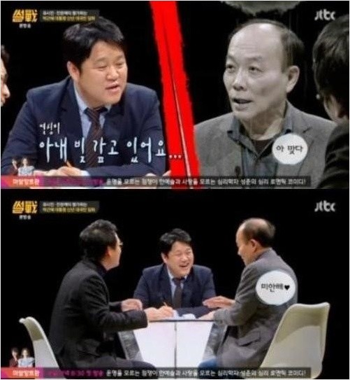 하지만 전원책은 굴하지 않고 "그렇게 되면 김구라는 빚을 탕감을 받는다"라고 비유를 했다. 이에 김구라가"저는 열심히 아내의 빚을 갚고 있는 사람"이라고 말하자 전원책은 "일심동체였으니까… 김구라 씨를 늘 안타깝게 생각한다"고 말하며 웃음을 자아냈다.