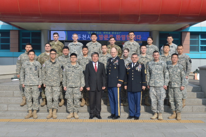 최근 경기 동두천시는 상황실에서 미군과 함께하는 영어교실 운영 유공자에 표창을 수여하고 간담회를 개최했다. 사진은 행사에 참석한 오세창 시장(앞줄 가운데)과 관계자들이 기념촬영을 하는 모습.(사진제공=동두천시청)