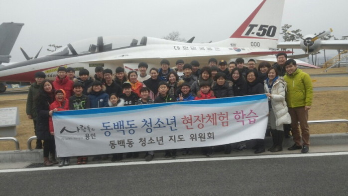 최근 경기 용인시 기흥구 동백동 청소년지도위원회는 지역청소년 29명과 함께 경남 사천의 (주)한국항공우주산업(KAI)을 방문해 진로체험 행사를 열었다. 사진은 행사에 참가한 관계자들이 기념촬영을 하는 모습.(사진제공=용인시청)