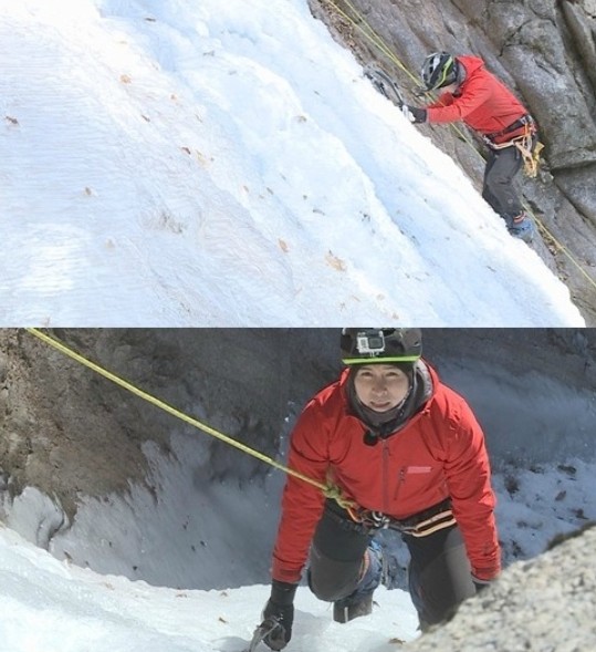 이 날 김동완은 익스트림 스포츠 마니아답게 빨간색 등산복을 입고 한 겨울 빙벽을 거침없이 올라가는 모습을 선보였다.