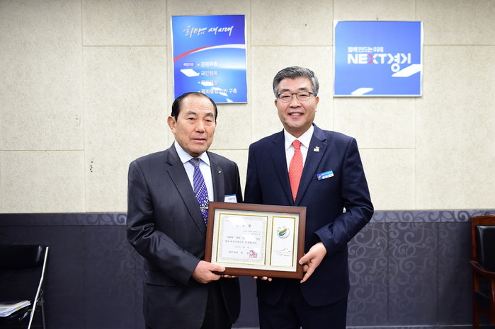 1일 경기 여주시는 2016년 일일명예시장 위촉식을 진행했다. 사진은 원경희 시장(오른쪽)이 일일명예시장으로 위촉된 반기진 게이트볼연합회장과 기념촬영을 하는 모습.(사진제공=여주시청)