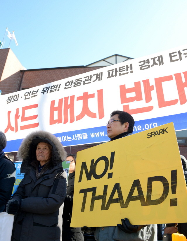 평통사를 비롯한 시민단체 회원들이 1일 오전 서울 청운동 주민센터 앞에서 한반도 평화 위협할 사드 배치 반대 긴급 기자회견을 열고 박근혜 정부의 사드 한국배치 관련 한미간 일체의 논의 중단을 촉구했다.