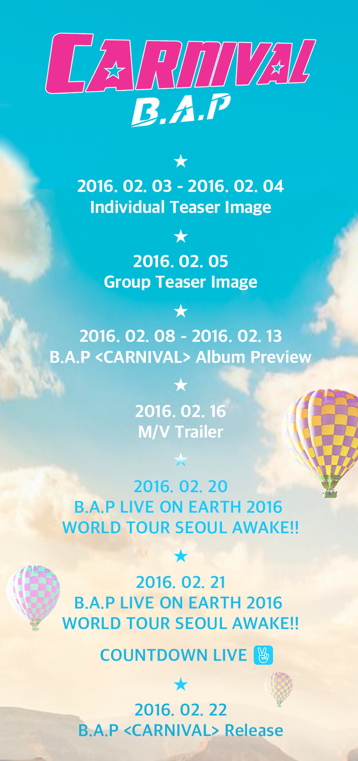 B.A.P의 다섯 번째 미니앨범 'CARNIVAL'은 총 6곡이 수록되며, 타이틀곡은 그동안 B.A.P가 선보인 카리스마 넘치는 곡들과 달리 한층 밝은 분위기의 노래로 알려져 음악팬들의 기대감을 높이고 있다.