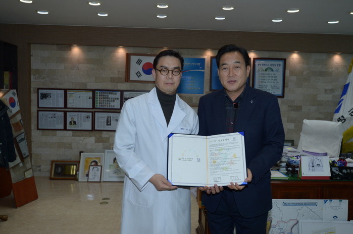 지난 1일 경기 양평군체육회와 엘한방병원이 체육인에 대한 의료비 감면을 내용으로 하는 의료협약을 체결했다. 사진은 김선교 군수(오른쪽)와 염종훈 엘한방병원장이 기념촬영을 하는 모습.(사진제공=양평군청)