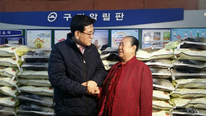 지난 2일 호남식당(나정순 할매 쭈꾸미)을 운영하는 나정순씨는 지역내 어려운 이웃을 위해 백미 20kg 200포(892만원 상당)를 동대문구에 기탁했다. 사진은 유덕열 구청장(왼쪽)이 나씨와 대화하는 모습.(사진제공=동대문구청)