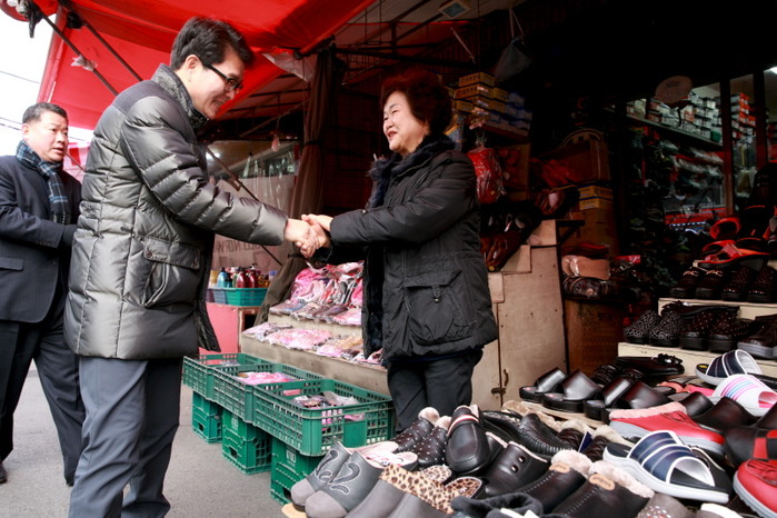 최근 정원오 성동구청장은 민족 최대 명절인 설을 맞아 '전통시장 민생투어'에 나섰다. 사진은 용답상가시장을 방문한 정원오 구청장(왼쪽)이 시장 상인과 악수를 나누는 모습.(사진제공=성동구청)
