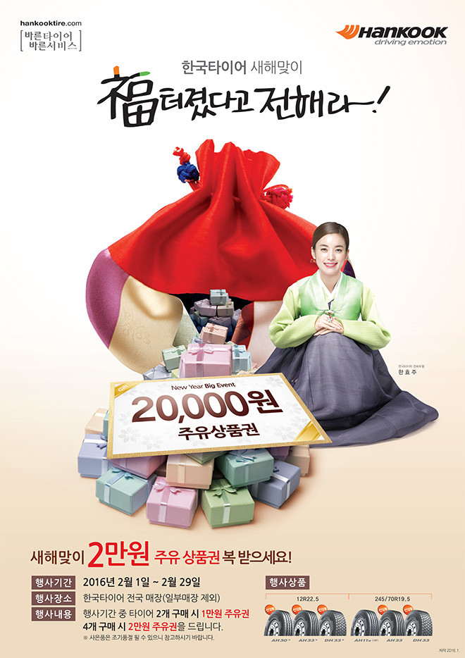 행사 대상 상품에는 마일리지 한계에 도전하는 최고의 전천후 타이어 AH30+, 최고의 카고/트랙터용 프리미엄 타이어 AH33+ 등 한국타이어의 고성능 상품이 포함되어 있다.
