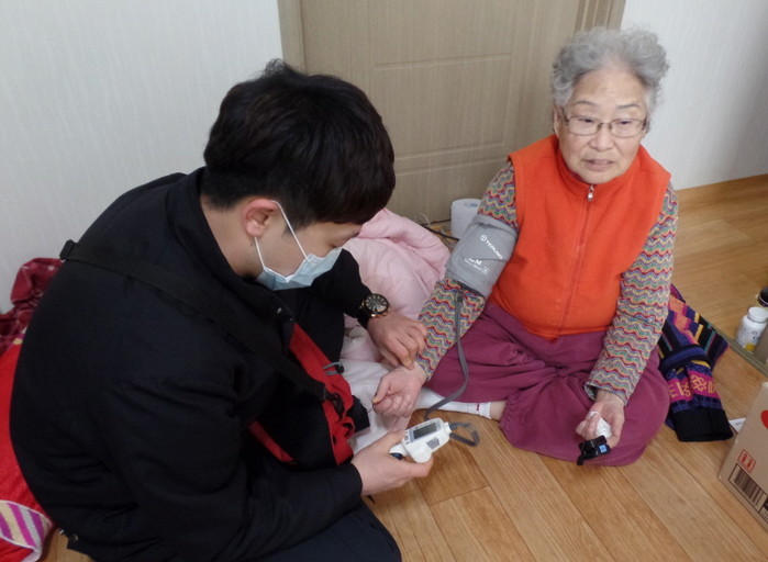 지난 2일 경기 군포소방서는 봉사활동의 일환으로 ‘119 이웃사촌 사랑나눔’을 진행했다. 사진은 봉사에 참석한 소방서 관계자가 노인의 혈압을 검사하는 모습.(사진제공=군포소방서)