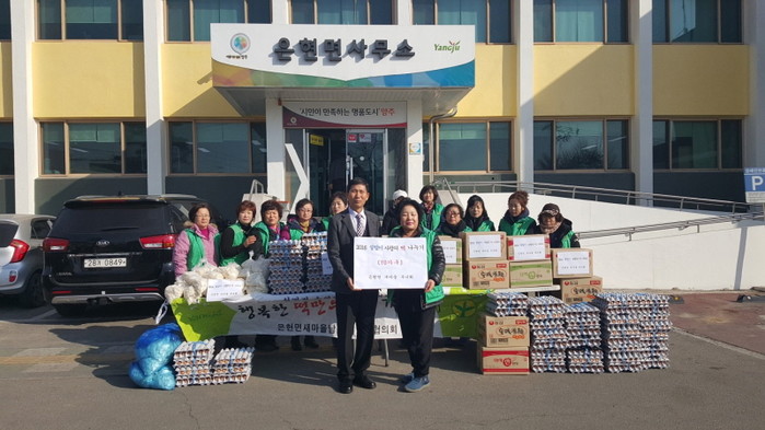 3일 경기 양주시 은현면 새마을부녀회는 지역내 저소득층 70가구를 방문해 ‘설맞이 사랑의 떡 나누기’ 행사를 열고 떡 140㎏, 만두 70㎏, 계란 70판, 라면 350개를 전달했다. 사진은 관계자들이 면사무소 앞에서 기념촬영을 하는 모습.(사진제공=양주시청)