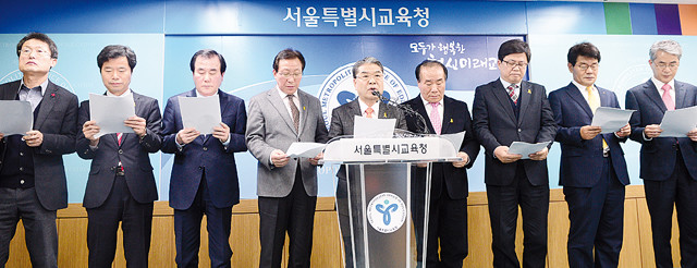 3일 오후 서울 종로구 서울교육청에서 이재정 경기도교육감을 비롯한 10개 시도교육감이 누리과정 문제의 근본적 해결을 위한 정부의 즉각적 조치를 촉구하는 기자회견을 갖고 있다. (왼쪽부터)서울 조희연, 전북 김승환, 충남 김지철, 강원 민병희, 경기 이재정, 광주 장휘국, 세종 최교진, 인천 이청연, 경남 박종훈.