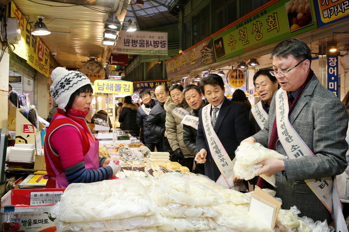 지난 2일 이춘표 경기 광명부시장(맨 오른쪽)은 설 명절을 앞두고 광명전통시장을 방문, 나상성 광명시의장(오른쪽에서 세 번째), 광명시물가모니터요원, 직원 등과 함께 ‘물가체험 및 전통시장 살리기 캠페인’을 실시했다.(사진제공=광명시청)