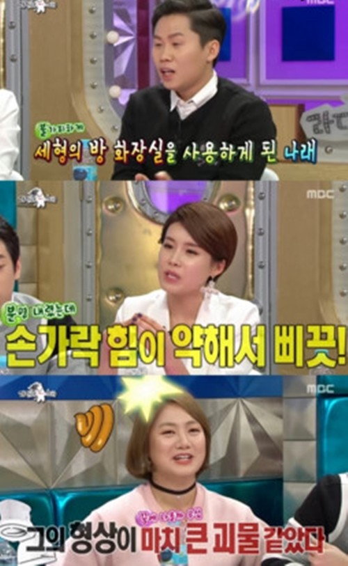 양세형은 이날 "제가 좀 깔끔한 편이라 제 방 화장실을 다른 사람이 쓰는 걸 싫어한다"며 "그런데 어느 날 박나래가 저희 집에 왔는데 큰 볼일이 급해 제 방 화장실을 썼다. 그런데 박나래가 나오고 나서 제가 화장실을 들어가 봤더니"라고 말문을 열었다.