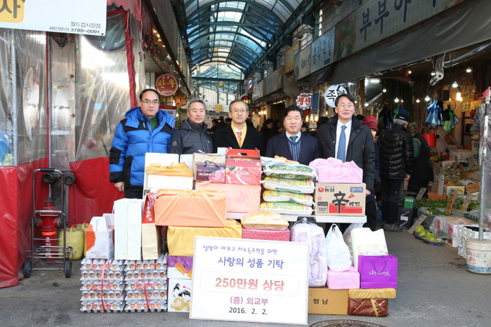 지난 2일 서울 마포구 망원동 소재 월드컵재래시장에서 임성남 외교부 제1차관(가운데)이 설맞이 마포구 저소득주민을 위한 250만원 상당의 성품을 마포구에 기탁하고 김경한 부구청장(오른쪽에서 두 번째)과 기념촬영을 하고 있다.
