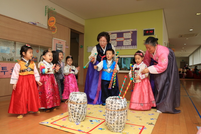 지난 3일 성동구 용답어린이집에서는 민족 최대의 명절 설을 맞아 다채로운 행사를 열었다. 사진은 한복을 곱게 차려 입은 아이들이 할아버지, 할머니와 함께 투호놀이를 하는 모습.(사진제공=성동구청)