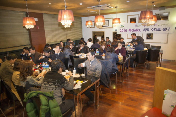 은평구는 최근 구청 구내식당에서 '7급 공무원 소통마당'을 진행했다. 사진은 행사에 참석한 공무원들이 치킨과 피자, 맥주, 음료 등을 즐기면서 대화하는 모습.(사진제공=은평구청)