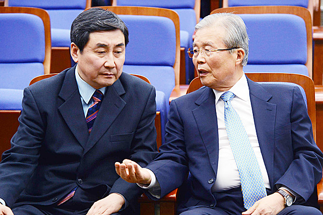 더불어민주당 김종인 비상대책위원장과 이종걸 원내대표가 4일 서울 여의도 국회에서 열린 의원총회에서 대화를 나누고 있다.
