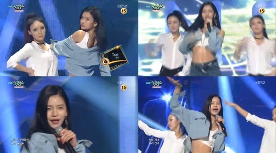 안다는 5일 방송된 KBS2 '뮤직뱅크'에서 청바지와 흰색 탱크탑을 입고 청재킷을 걸쳐 요염한 매력을 발산했다.