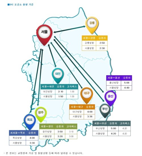 요금소를 기준으로 아침 8시 서울에서 출발하면 부산까지는 5시간, 광주까지는 3시간 40분, 대전까지는 2시간 20분, 강릉까지 2시간 50분이 걸릴 전망이다.