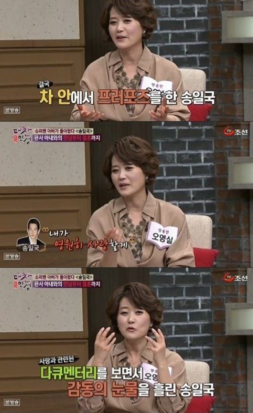 과거 방송된 '대찬인생'에서 방송인 오영실은 "배우 송일국이 정승연 판사에게 차 안에서 프로포즈를 했다며"며 이목을 집중시켰다.