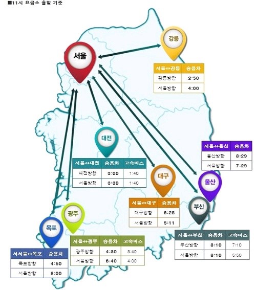 8일 한국도로공사에 따르면 이날 오전 11시 요금소 기준 서울에서 부산까지는 양방향 모두 8시간 10분이 걸린다.