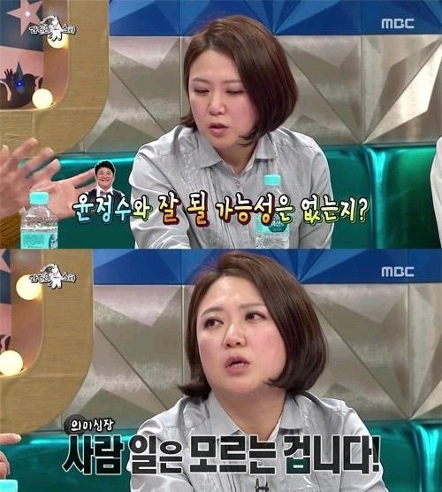 김숙은 최근 mbc '라디오스타'에 출연해 윤정수와 잘 될 가능성이 없냐는 질문에 답한 바 있다.