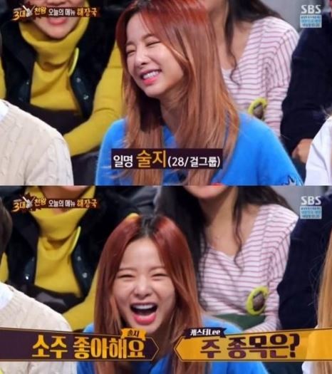 이어 이휘재는 "주종목이 뭐냐"라고 물었고 솔지는 "소주 좋아해요"라고 솔직하게 답했다.