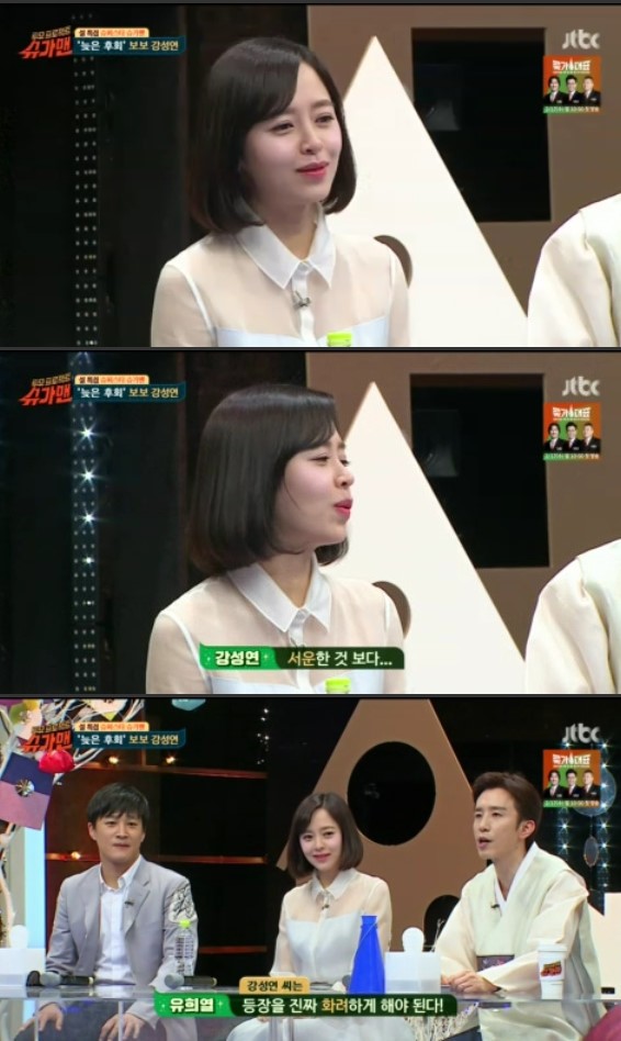 강성연은 '슈가맨'에서 과거 가수 보보 시절을 회상하며 '늦은후회'를 불러 애절한 목소리리와 감정 표현으로 보는 이들의 마음을 울렸다.