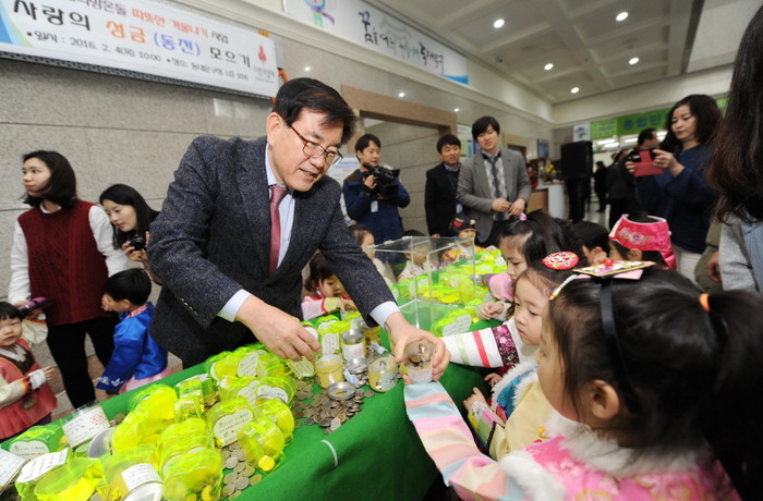 동대문구는 최근 구청 1층 로비에서 '사랑의 성금(동전) 모으기' 행사를 개최하고 총 3800여만원을 모금했다. 사진은 이날 행사에서 유덕열 구청장이 아이들이 가져온 동전을 받는 모습.(사진제공=동대문구청)
