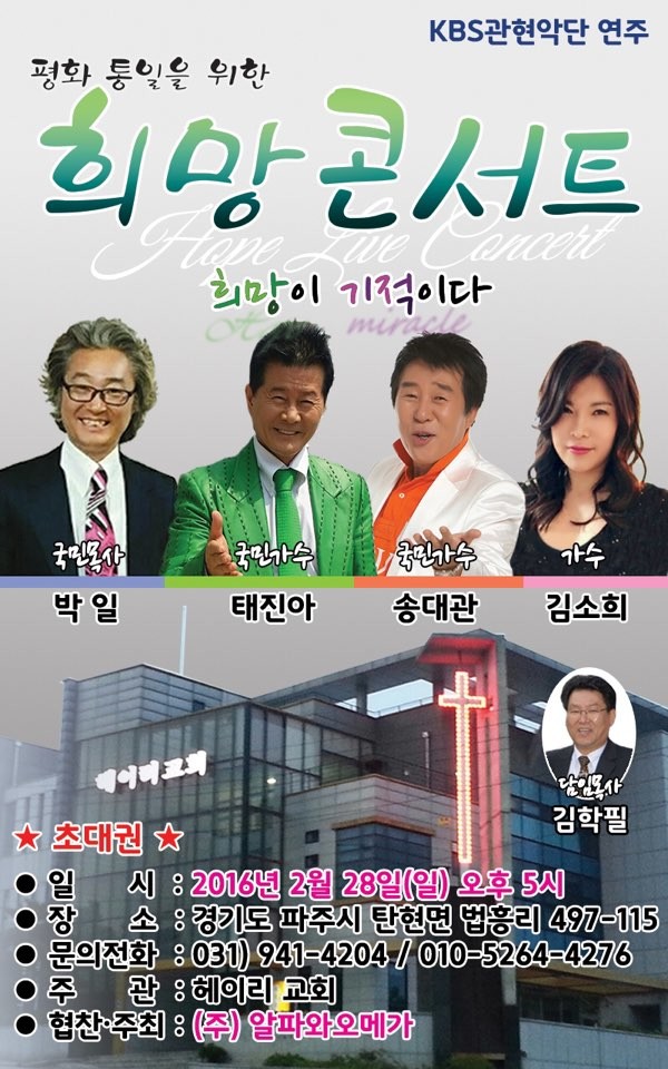 이번 희망 콘서트는 경기도 파주시 탄현면에 위치한 헤이리 교회에서 열리며, 태진아를 비롯해 국민가수 송대관, 김소희 등 인기 가수들이 총출동해 성도들과 뜻 깊은 자리를 가진다.