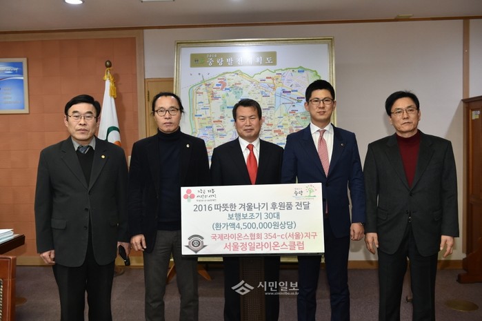 지난 11일 중랑구는 구청에서 '따뜻한 겨울나기 후원품 전달식'을 진행했다. 사진은 나진구 구청장(가운데)이 '서울정일라이온스클럽' 관계자에게 450만원 상당의 보행보조기 30대를 전달받고 기념촬영을 하는 모습.(사진제공=중랑구청)