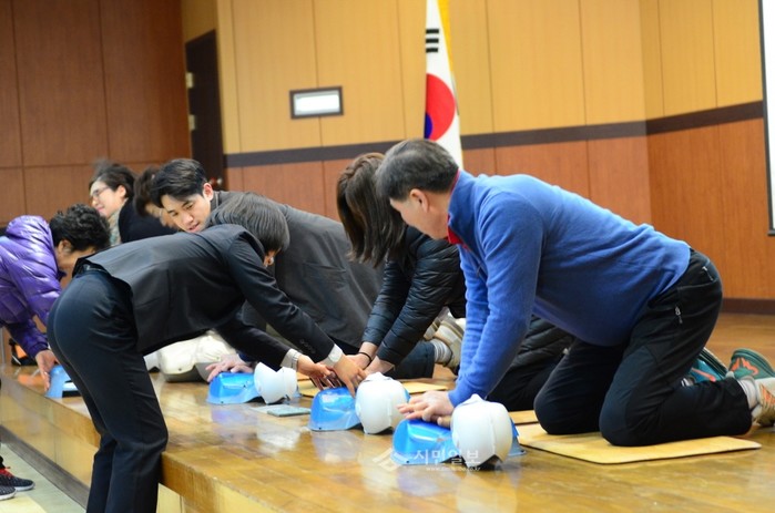 지난 11일 서울 영등포소방서는 4층 강당에서 다중이용업소 영업주 및 관계자들을 대상으로 소방안전교육을 실시했다. 사진은 교육에 참석한 관계자들이 심폐소생술 실습을 하는 모습.(사진제공=영등포소방서)