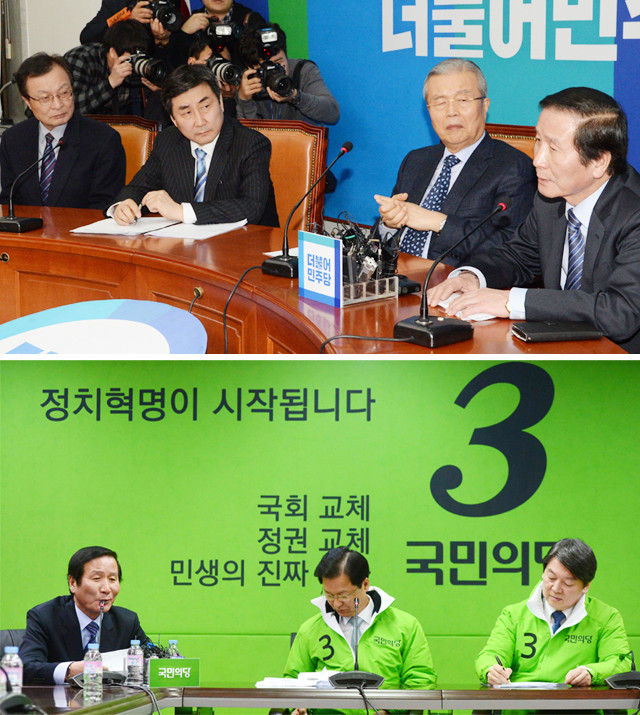 정기섭 개성공단기업협회장이 12일 오전 서울 여의도 국회에서 더불어민주당 김종인 비대위원장, 이종걸 원내대표, 이해찬 의원, 변재일 비대위원 등과 면담하고 있다(왼쪽). 같은 날 12일 서울 마포구 국민의당사에서 열린 개성공단입주기업대표자 면담에서 정기섭 개성공단기업협회장이 입장을 밝히고 있다.