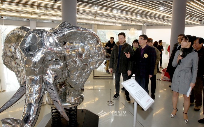 경기 광명시는 광명업사이클아트센터에서 오는 4월24일까지 버려지는 각종 폐품 용기를 활용해 코끼리·호랑이 등의 예술작품을 제작해 업사이클 아트전시 ‘용기백배전’을 열고 있다. 사진은 15일 양기대 시장(가운데)이 폐품으로 만든 코끼리 작품을 만든 작가에게 설명을 듣고 있는 모습.(사진제공=광명시청)